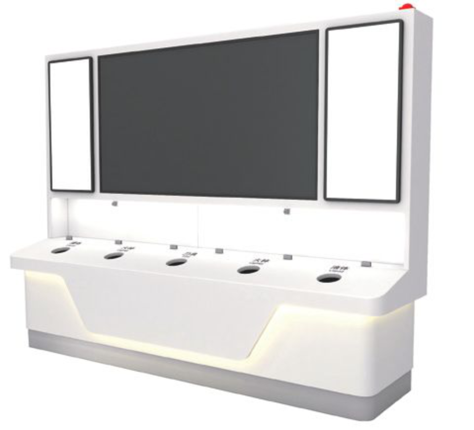 Lada ekspozycyjna przedmiotów zabronionych to specjalistyczne stanowisko przeznaczone do prezentacji przedmiotów zatrzymanych podczas kontroli bezpieczeństwa w przestrzeniach publicznych, takich jak lotniska, terminale transportowe oraz inne obiekty infrastruktury transportowej. Konstrukcja wykonana jest z wielowarstwowej płyty wykończonej ognioodpornym laminatem, co zapewnia stabilność i wysoką odporność na intensywne użytkowanie. Powierzchnia z wysokiej jakości kamienia sztucznego nadaje ladzie nowoczesny i estetyczny wygląd. Blat roboczy wykonany z kompaktowego laminatu ognioodpornego zwiększa trwałość oraz odporność na uszkodzenia mechaniczne. Witryny z hartowanego szkła umożliwiają bezpieczną i czytelną prezentację eksponowanych przedmiotów. Ukryte listwy LED z ciepłym białym światłem poprawiają widoczność ekspozycji. Konstrukcję uzupełniają półki oraz listwy wykonane ze szczotkowanej stali