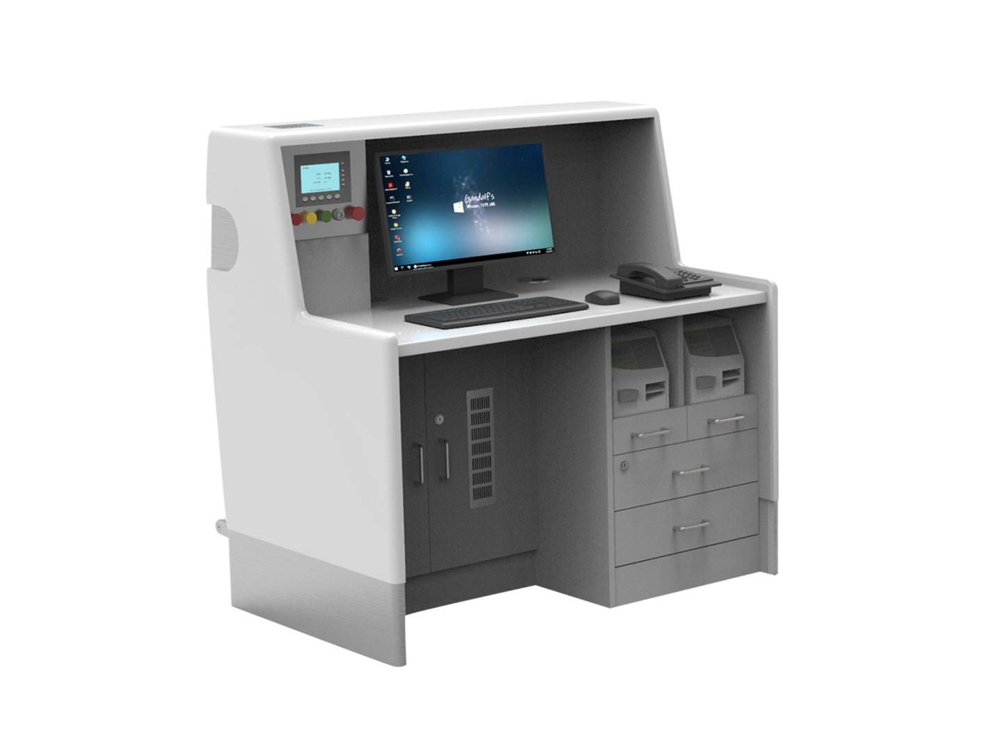 Lada check-in przeznaczona do obsługi pasażerów w portach lotniczych oraz terminalach transportowych. Konstrukcja zapewnia ergonomiczne stanowisko pracy dla personelu oraz sprawną organizację przestrzeni obsługi.
