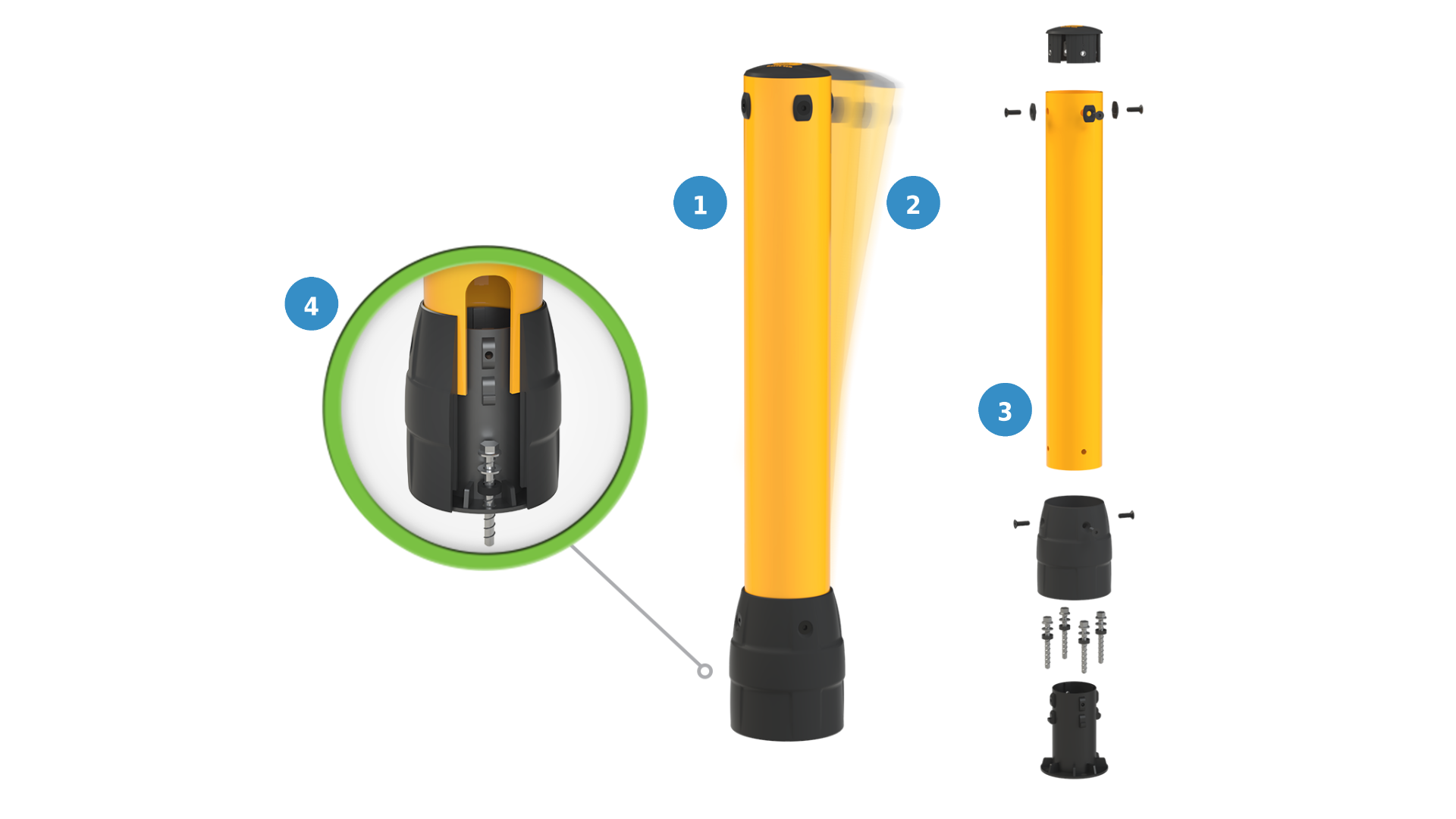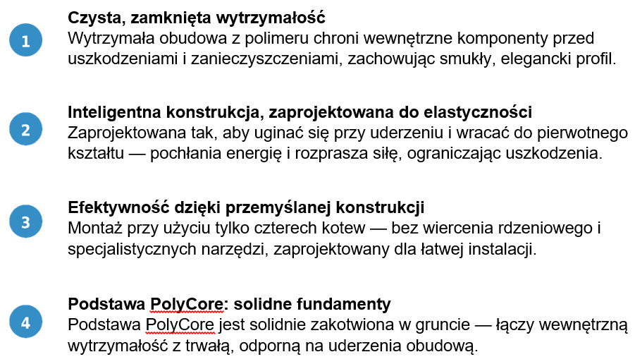 Zintegrowana podstawa PolyCore zapewnia stabilne mocowanie do podłoża, łącząc wysoką wytrzymałość z odpornością na uderzenia. Obudowa chroni wewnętrzne elementy przed uszkodzeniami i zanieczyszczeniami, zachowując estetyczny i kompaktowy wygląd.