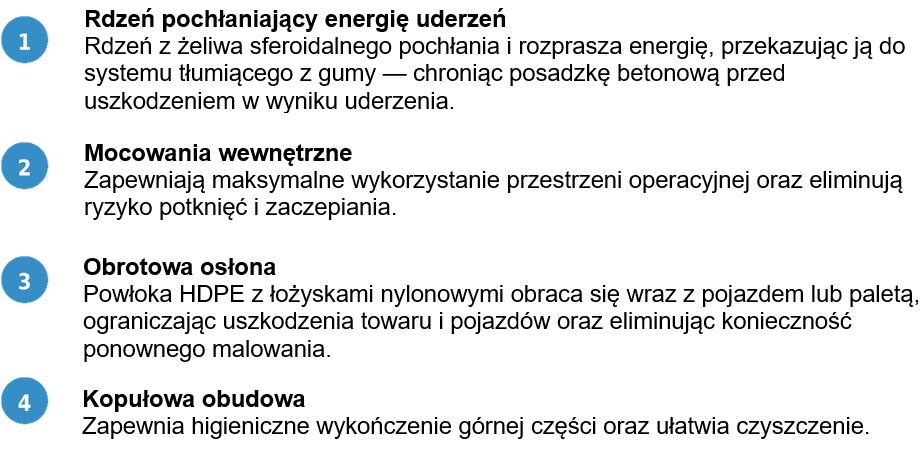 Dzięki zdolności do odchylenia i obrotu rozprasza energię uderzeń, skutecznie chroniąc przed uderzeniami bocznymi — idealny do intensywnie eksploatowanych narożników. Zaprojektowany z myślą o szybkim montażu i bezobsługowej pracy, zapewnia niezawodne działanie przez długi czas.